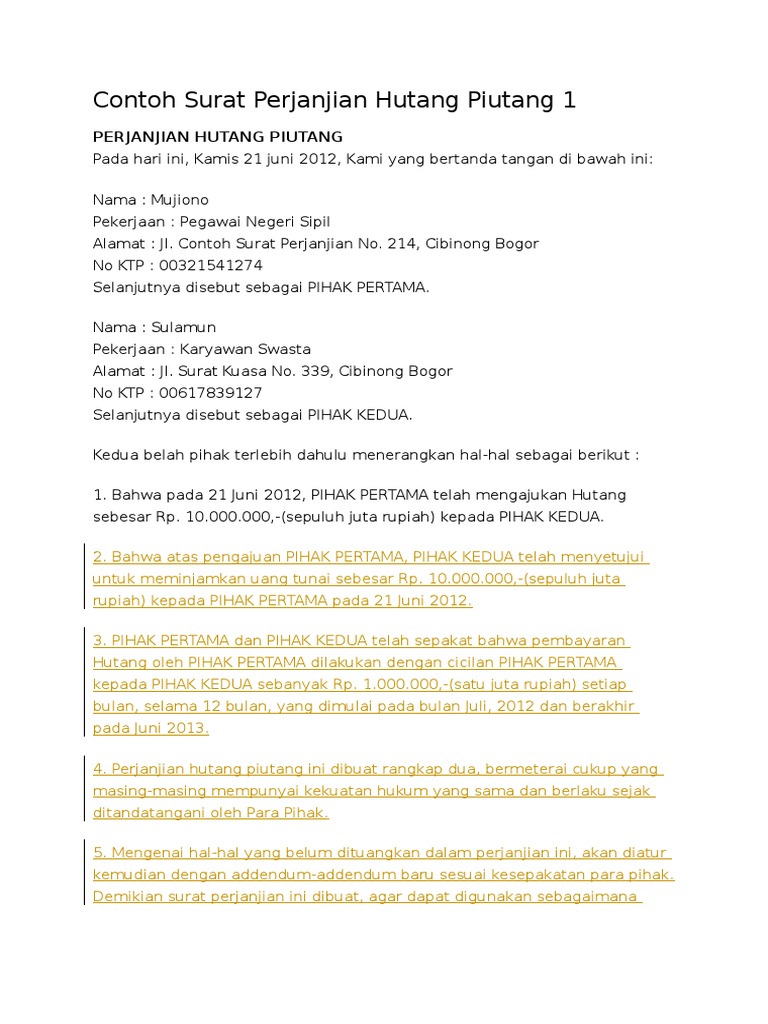 Contoh Surat Perjanjian Hutang Piutang Sederhana Dan Baik Contoh Surat