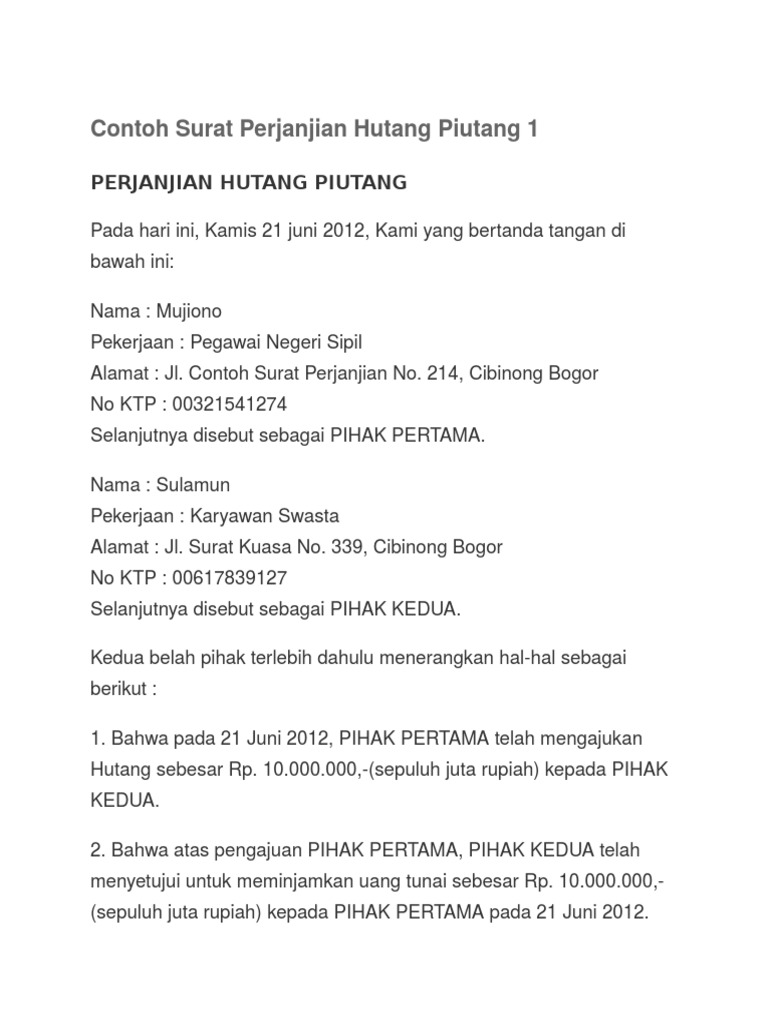 Surat ini berguna untuk mengikat antara kedua belah pihak agar mereka mememuhi kewajiban yang telah ditentukandisepakati oleh kedua belah pihak sebelumnya. Contoh surat perjanjian hutang piutang artikel ini berisi 3 contoh bentuk surat perjanjian yg berhubungan dgn hutang piutang atau pinjam meminjam uang. Contoh surat gugatan utang piutang.
